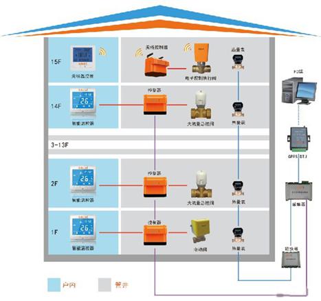 室溫控制器與遠傳電動閥門通常采用無線470MHz頻段通訊;閥門控制器與終端服務器采用MBUS+GPRS進行通信,實現遠程抄取用戶家庭溫度,熱量,遠程控制用戶閥門開關等功能。